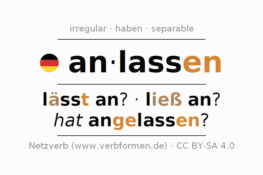 Examples for using the conjugation of the verb anlassen. These are real sentences and sentences from the project Tatoeba. For each conjugated form, such a sentence example is displayed. The verb form is highlighted. If there are more than one sentence, an example with the German verb anlassen is selected. In order to understand the conjugation not only by the examples, but also to train, worksheets for the verb anlassen are available.