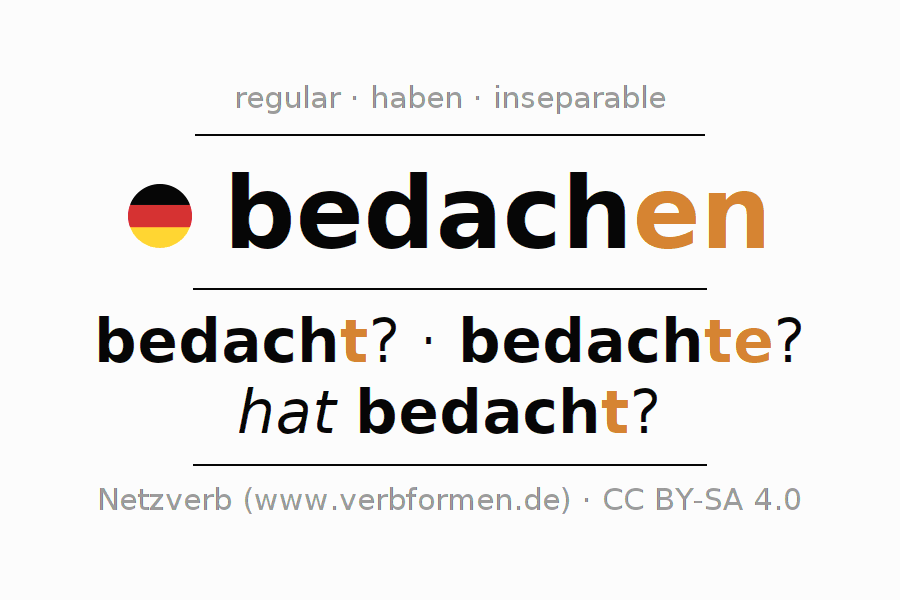 Examples for using the conjugation of the verb bedachen. These are real sentences and sentences from the project Tatoeba. For each conjugated form, such a sentence example is displayed. The verb form is highlighted. If there are more than one sentence, an example with the German verb bedachen is selected. In order to understand the conjugation not only by the examples, but also to train, worksheets for the verb bedachen are available.