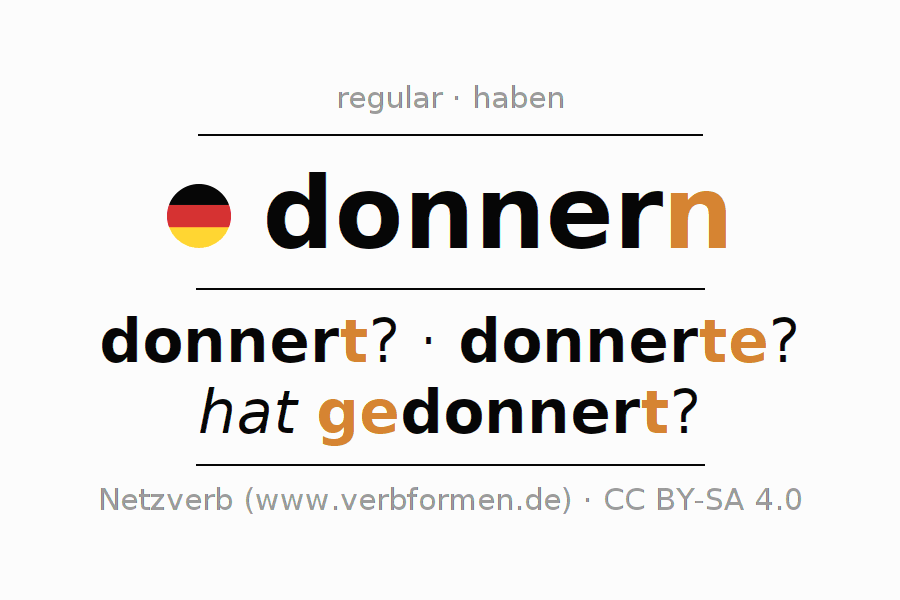 Examples for using the conjugation of the verb donnern. These are real sentences and sentences from the project Tatoeba. For each conjugated form, such a sentence example is displayed. The verb form is highlighted. If there are more than one sentence, an example with the German verb donnern (hat) is selected. In order to understand the conjugation not only by the examples, but also to train, worksheets for the verb donnern are available.