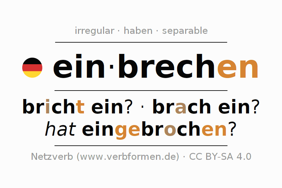 Examples for using the conjugation of the verb einbrechen. These are real sentences and sentences from the project Tatoeba. For each conjugated form, such a sentence example is displayed. The verb form is highlighted. If there are more than one sentence, an example with the German verb einbrechen (hat) is selected. In order to understand the conjugation not only by the examples, but also to train, worksheets for the verb einbrechen are available.