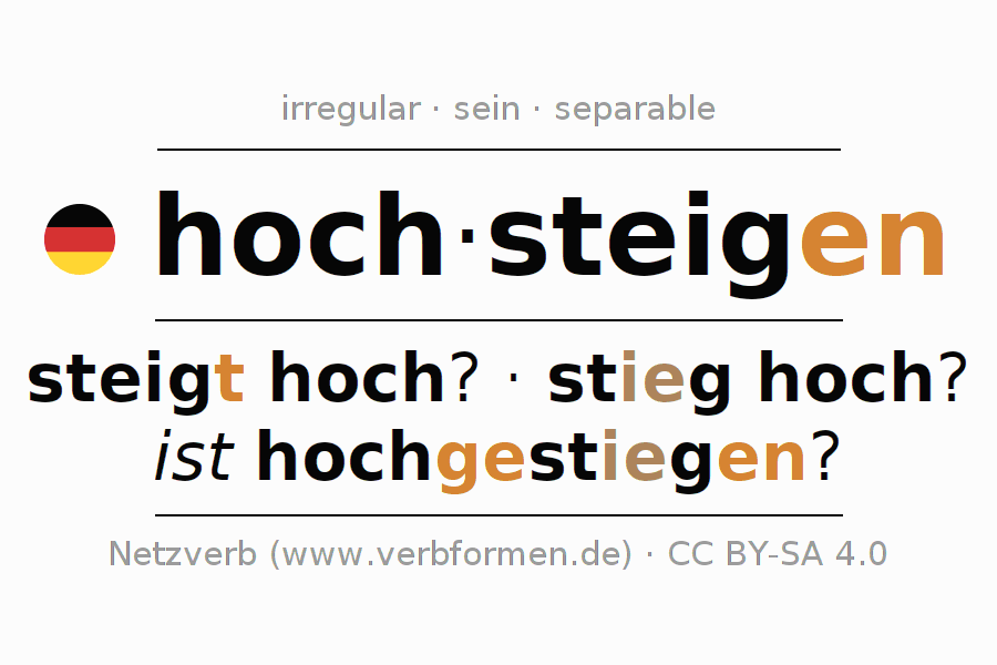Examples for using the conjugation of the verb hochsteigen. These are real sentences and sentences from the project Tatoeba. For each conjugated form, such a sentence example is displayed. The verb form is highlighted. If there are more than one sentence, an example with the German verb hochsteigen is selected. In order to understand the conjugation not only by the examples, but also to train, worksheets for the verb hochsteigen are available.
