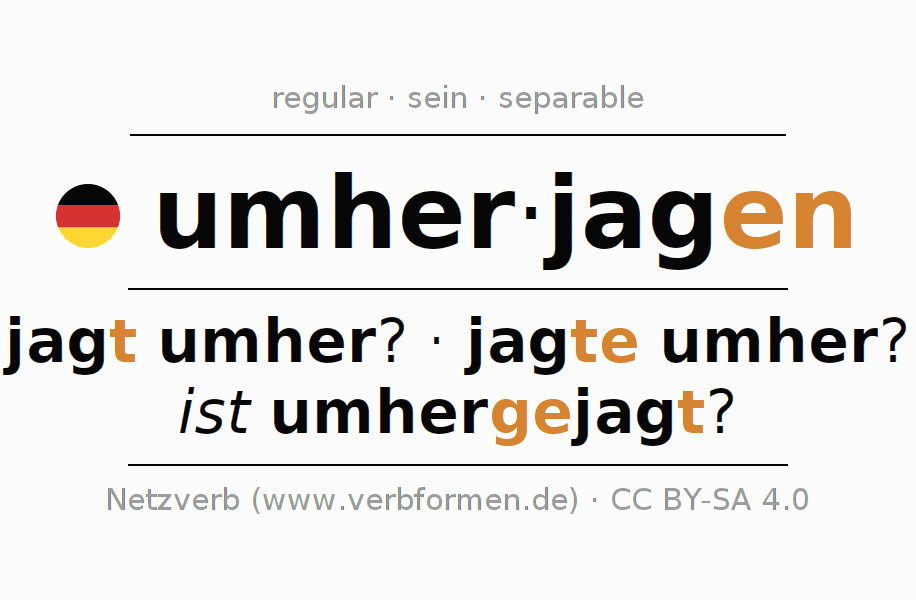 Examples for using the conjugation of the verb umherjagen. These are real sentences and sentences from the project Tatoeba. For each conjugated form, such a sentence example is displayed. The verb form is highlighted. If there are more than one sentence, an example with the German verb umherjagen (ist) is selected. In order to understand the conjugation not only by the examples, but also to train, worksheets for the verb umherjagen are available.