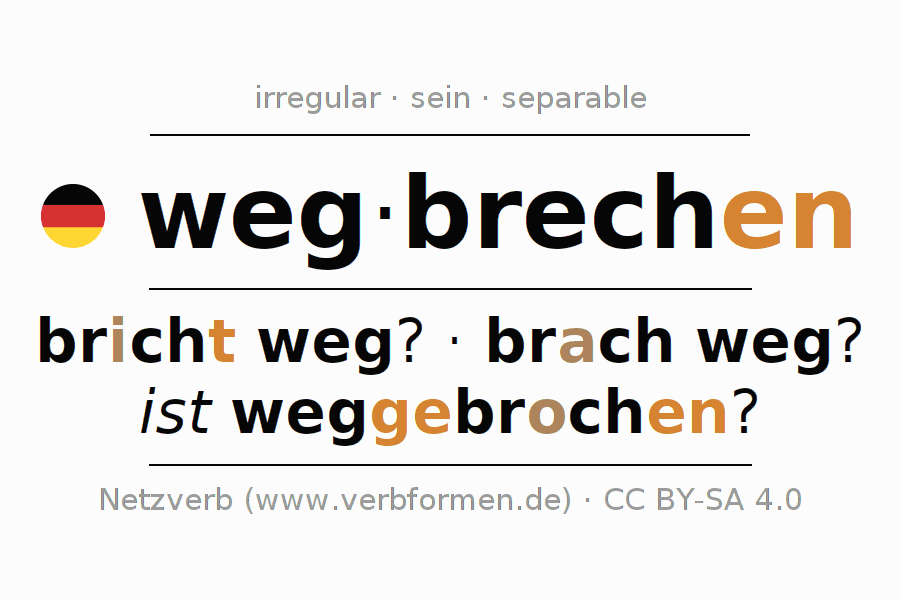 Examples for using the conjugation of the verb wegbrechen. These are real sentences and sentences from the project Tatoeba. For each conjugated form, such a sentence example is displayed. The verb form is highlighted. If there are more than one sentence, an example with the German verb wegbrechen is selected. In order to understand the conjugation not only by the examples, but also to train, worksheets for the verb wegbrechen are available.