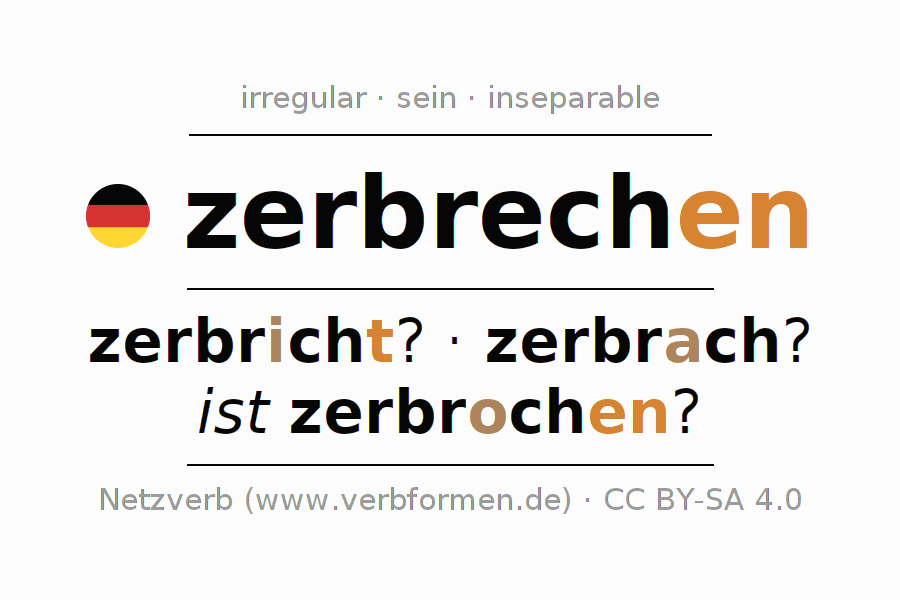 Examples for using the conjugation of the verb zerbrechen. These are real sentences and sentences from the project Tatoeba. For each conjugated form, such a sentence example is displayed. The verb form is highlighted. If there are more than one sentence, an example with the German verb zerbrechen (ist) is selected. In order to understand the conjugation not only by the examples, but also to train, worksheets for the verb zerbrechen are available.