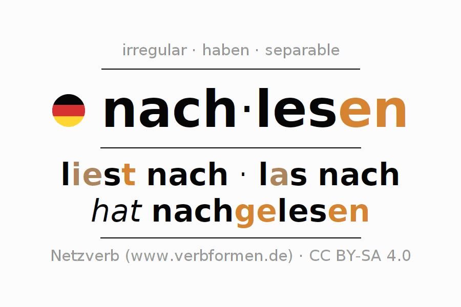 Examples for using the conjugation of the verb nachlesen. These are real sentences and sentences from the project Tatoeba. For each conjugated form, such a sentence example is displayed. The verb form is highlighted. If there are more than one sentence, an example with the German verb nachlesen is selected. In order to understand the conjugation not only by the examples, but also to train, worksheets for the verb nachlesen are available.