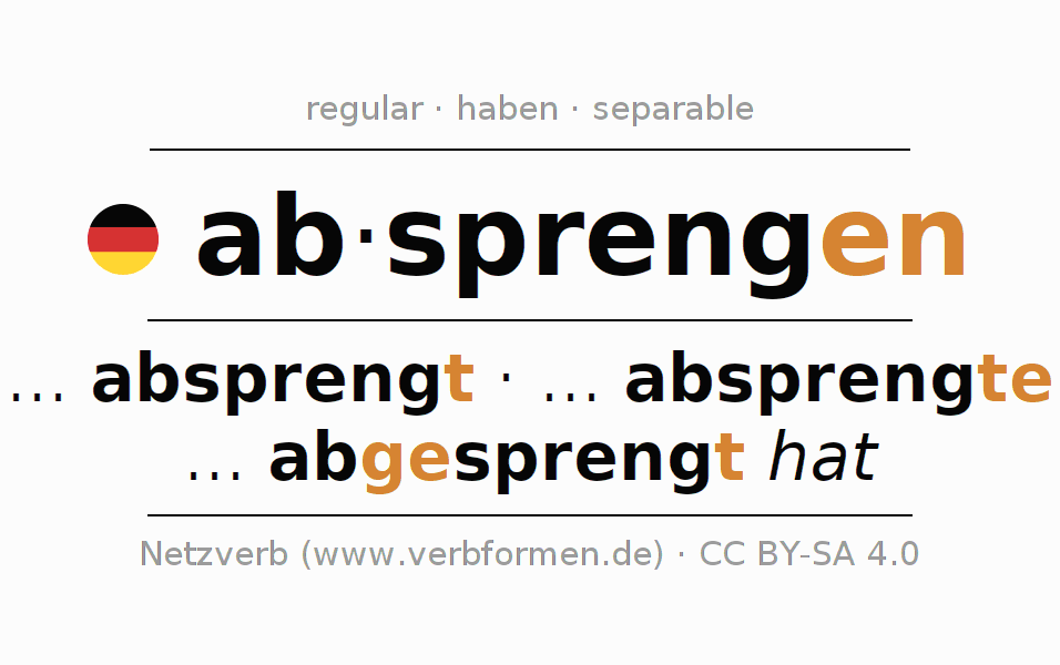 Examples for using the conjugation of the verb absprengen. These are real sentences and sentences from the project Tatoeba. For each conjugated form, such a sentence example is displayed. The verb form is highlighted. If there are more than one sentence, an example with the German verb absprengen is selected. In order to understand the conjugation not only by the examples, but also to train, worksheets for the verb absprengen are available.