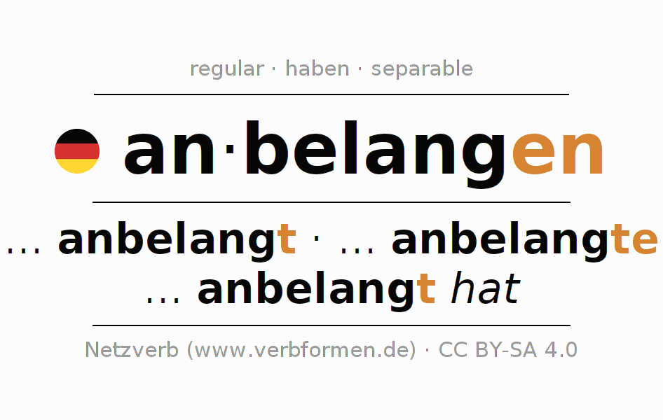 Examples for using the conjugation of the verb anbelangen. These are real sentences and sentences from the project Tatoeba. For each conjugated form, such a sentence example is displayed. The verb form is highlighted. If there are more than one sentence, an example with the German verb anbelangen is selected. In order to understand the conjugation not only by the examples, but also to train, worksheets for the verb anbelangen are available.