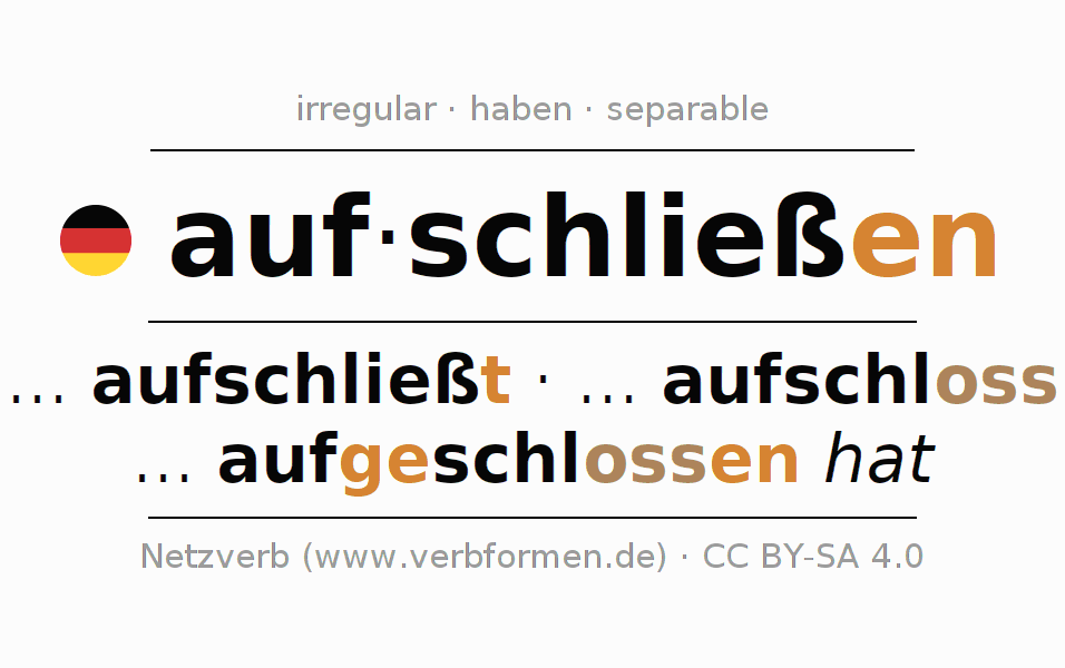 Examples for using the conjugation of the verb aufschließen. These are real sentences and sentences from the project Tatoeba. For each conjugated form, such a sentence example is displayed. The verb form is highlighted. If there are more than one sentence, an example with the German verb aufschließen is selected. In order to understand the conjugation not only by the examples, but also to train, worksheets for the verb aufschließen are available.