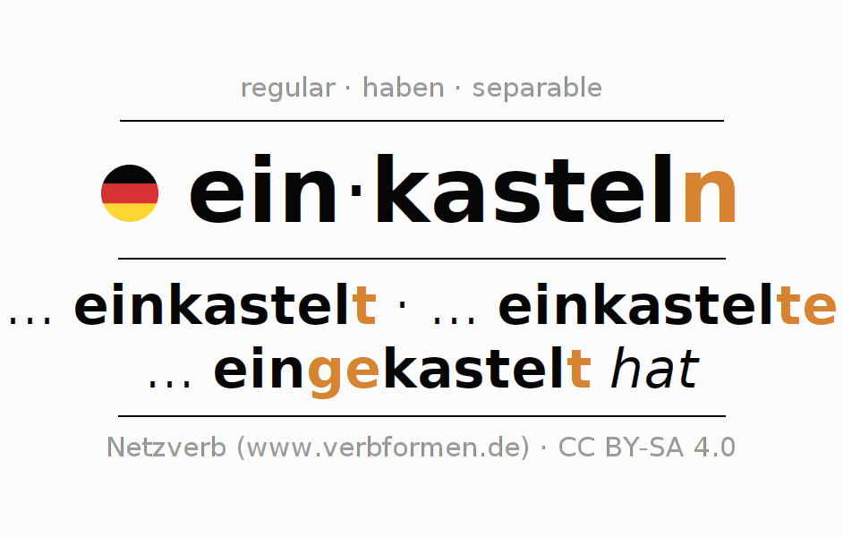 Examples for using the conjugation of the verb einkasteln. These are real sentences and sentences from the project Tatoeba. For each conjugated form, such a sentence example is displayed. The verb form is highlighted. If there are more than one sentence, an example with the German verb einkasteln is selected. In order to understand the conjugation not only by the examples, but also to train, worksheets for the verb einkasteln are available.