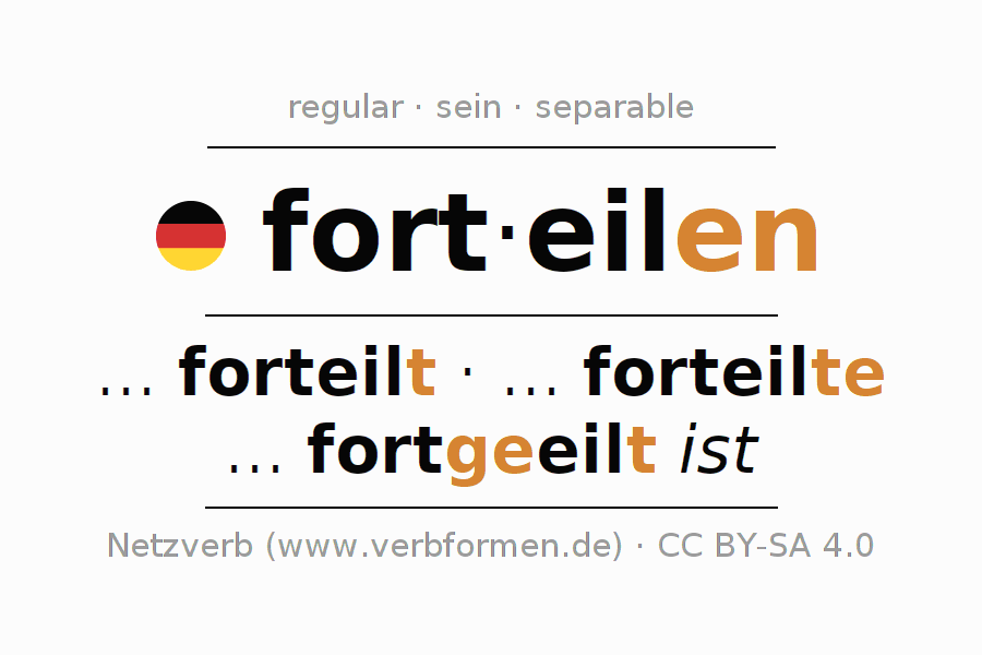 Examples for using the conjugation of the verb forteilen. These are real sentences and sentences from the project Tatoeba. For each conjugated form, such a sentence example is displayed. The verb form is highlighted. If there are more than one sentence, an example with the German verb forteilen is selected. In order to understand the conjugation not only by the examples, but also to train, worksheets for the verb forteilen are available.