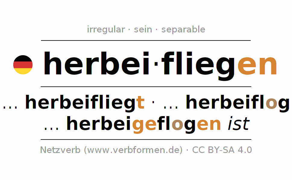 Examples for using the conjugation of the verb herbeifliegen. These are real sentences and sentences from the project Tatoeba. For each conjugated form, such a sentence example is displayed. The verb form is highlighted. If there are more than one sentence, an example with the German verb herbeifliegen is selected. In order to understand the conjugation not only by the examples, but also to train, worksheets for the verb herbeifliegen are available.