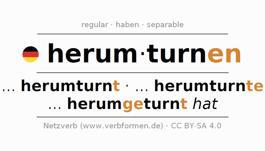 Examples for using the conjugation of the verb herumturnen. These are real sentences and sentences from the project Tatoeba. For each conjugated form, such a sentence example is displayed. The verb form is highlighted. If there are more than one sentence, an example with the German verb herumturnen (hat) is selected. In order to understand the conjugation not only by the examples, but also to train, worksheets for the verb herumturnen are available.