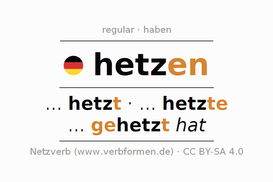 Examples for using the conjugation of the verb hetzen. These are real sentences and sentences from the project Tatoeba. For each conjugated form, such a sentence example is displayed. The verb form is highlighted. If there are more than one sentence, an example with the German verb hetzen (hat) is selected. In order to understand the conjugation not only by the examples, but also to train, worksheets for the verb hetzen are available.