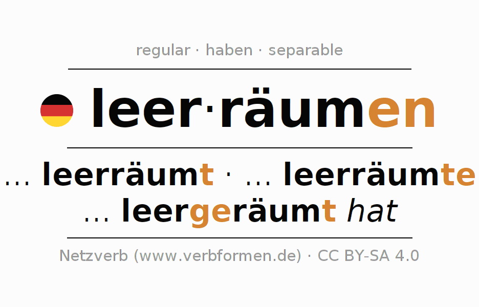 Examples for using the conjugation of the verb leerräumen. These are real sentences and sentences from the project Tatoeba. For each conjugated form, such a sentence example is displayed. The verb form is highlighted. If there are more than one sentence, an example with the German verb leerräumen is selected. In order to understand the conjugation not only by the examples, but also to train, worksheets for the verb leerräumen are available.
