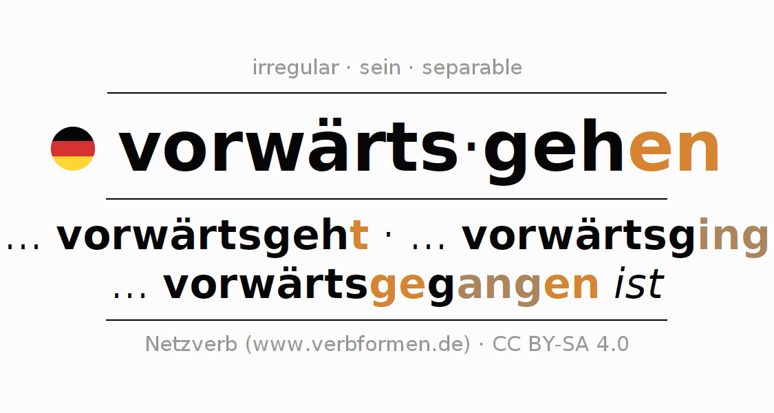 Examples for using the conjugation of the verb vorwärtsgehen. These are real sentences and sentences from the project Tatoeba. For each conjugated form, such a sentence example is displayed. The verb form is highlighted. If there are more than one sentence, an example with the German verb vorwärtsgehen is selected. In order to understand the conjugation not only by the examples, but also to train, worksheets for the verb vorwärtsgehen are available.