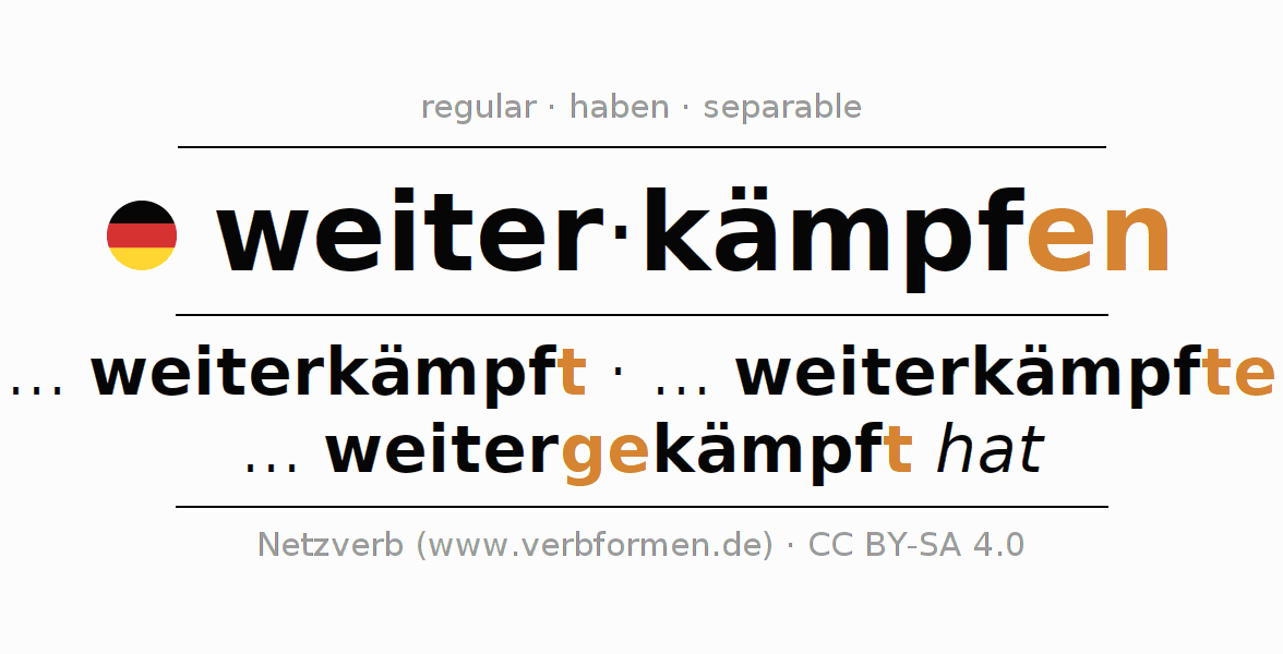 Examples for using the conjugation of the verb weiterkämpfen. These are real sentences and sentences from the project Tatoeba. For each conjugated form, such a sentence example is displayed. The verb form is highlighted. If there are more than one sentence, an example with the German verb weiterkämpfen is selected. In order to understand the conjugation not only by the examples, but also to train, worksheets for the verb weiterkämpfen are available.