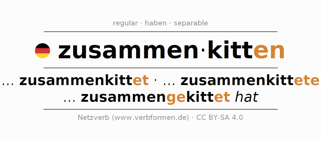 Examples for using the conjugation of the verb zusammenkitten. These are real sentences and sentences from the project Tatoeba. For each conjugated form, such a sentence example is displayed. The verb form is highlighted. If there are more than one sentence, an example with the German verb zusammenkitten is selected. In order to understand the conjugation not only by the examples, but also to train, worksheets for the verb zusammenkitten are available.