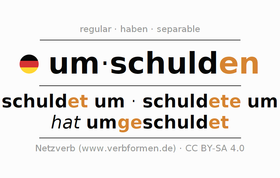 Meanings and synonyms of umschulden- einen alten Kreditgeber mit neu geliehenem Geld auszahlen, wodurch die Schuld nun gegenüber dem neuen Kreditgeber besteht