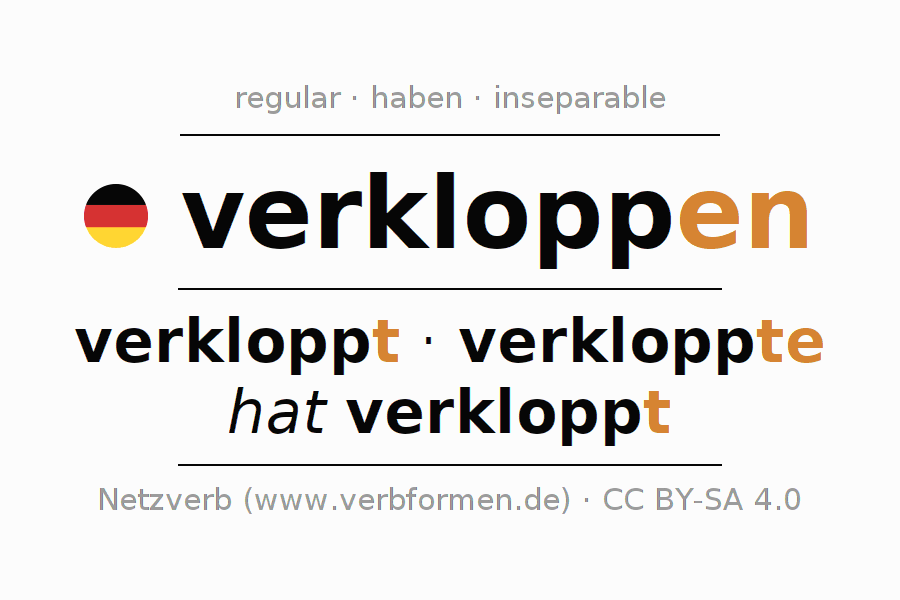 Examples for using the conjugation of the verb verkloppen. These are real sentences and sentences from the project Tatoeba. For each conjugated form, such a sentence example is displayed. The verb form is highlighted. If there are more than one sentence, an example with the German verb verkloppen is selected. In order to understand the conjugation not only by the examples, but also to train, worksheets for the verb verkloppen are available.