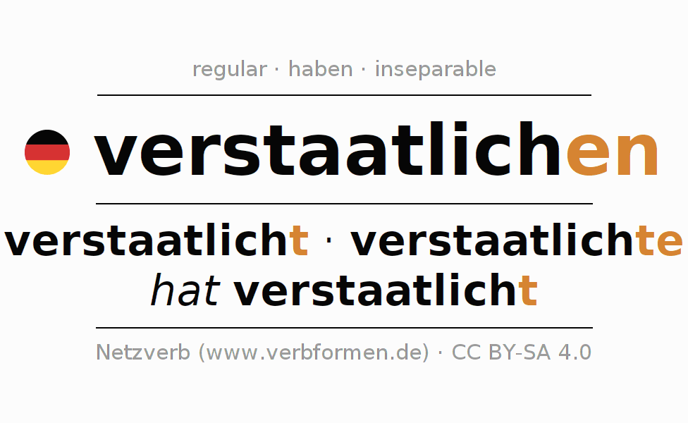 Examples for using the conjugation of the verb verstaatlichen. These are real sentences and sentences from the project Tatoeba. For each conjugated form, such a sentence example is displayed. The verb form is highlighted. If there are more than one sentence, an example with the German verb verstaatlichen is selected. In order to understand the conjugation not only by the examples, but also to train, worksheets for the verb verstaatlichen are available.