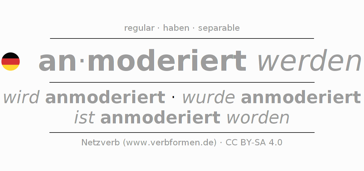 Examples for using the conjugation of the verb anmoderieren. These are real sentences and sentences from the project Tatoeba. For each conjugated form, such a sentence example is displayed. The verb form is highlighted. If there are more than one sentence, an example with the German verb anmoderieren is selected. In order to understand the conjugation not only by the examples, but also to train, worksheets for the verb anmoderieren are available.