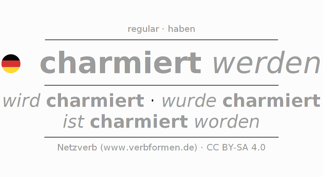 Examples for using the conjugation of the verb charmieren. These are real sentences and sentences from the project Tatoeba. For each conjugated form, such a sentence example is displayed. The verb form is highlighted. If there are more than one sentence, an example with the German verb charmieren is selected. In order to understand the conjugation not only by the examples, but also to train, worksheets for the verb charmieren are available.