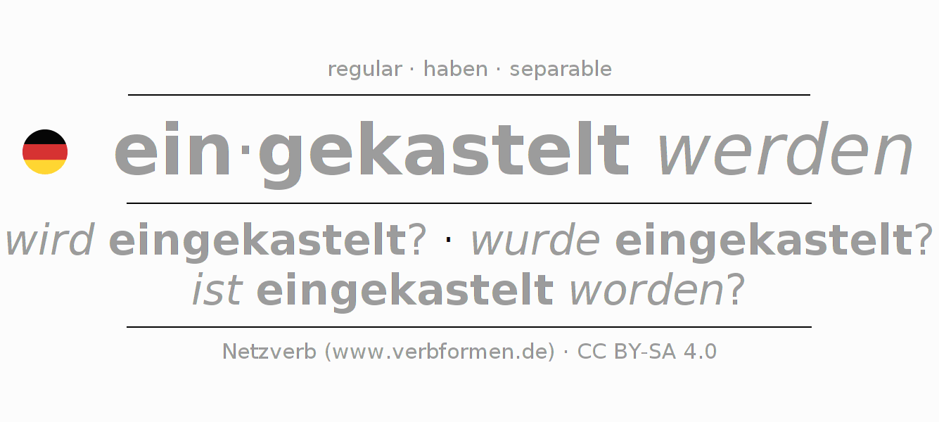 Examples for using the conjugation of the verb einkasteln. These are real sentences and sentences from the project Tatoeba. For each conjugated form, such a sentence example is displayed. The verb form is highlighted. If there are more than one sentence, an example with the German verb einkasteln is selected. In order to understand the conjugation not only by the examples, but also to train, worksheets for the verb einkasteln are available.