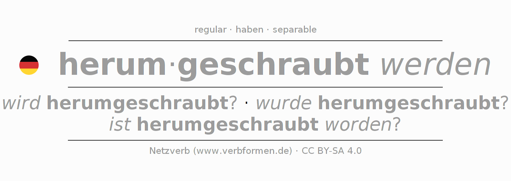 Examples for using the conjugation of the verb herumschrauben. These are real sentences and sentences from the project Tatoeba. For each conjugated form, such a sentence example is displayed. The verb form is highlighted. If there are more than one sentence, an example with the German verb herumschrauben is selected. In order to understand the conjugation not only by the examples, but also to train, worksheets for the verb herumschrauben are available.