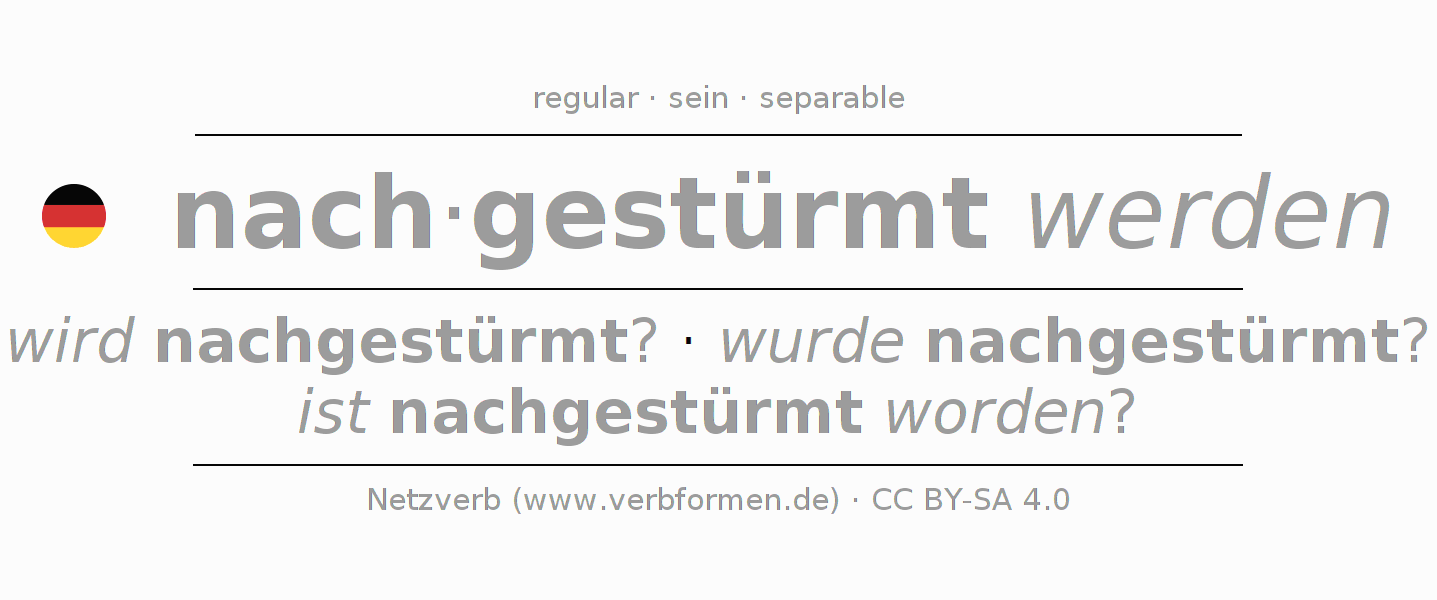 Examples for using the conjugation of the verb nachstürmen. These are real sentences and sentences from the project Tatoeba. For each conjugated form, such a sentence example is displayed. The verb form is highlighted. If there are more than one sentence, an example with the German verb nachstürmen is selected. In order to understand the conjugation not only by the examples, but also to train, worksheets for the verb nachstürmen are available.