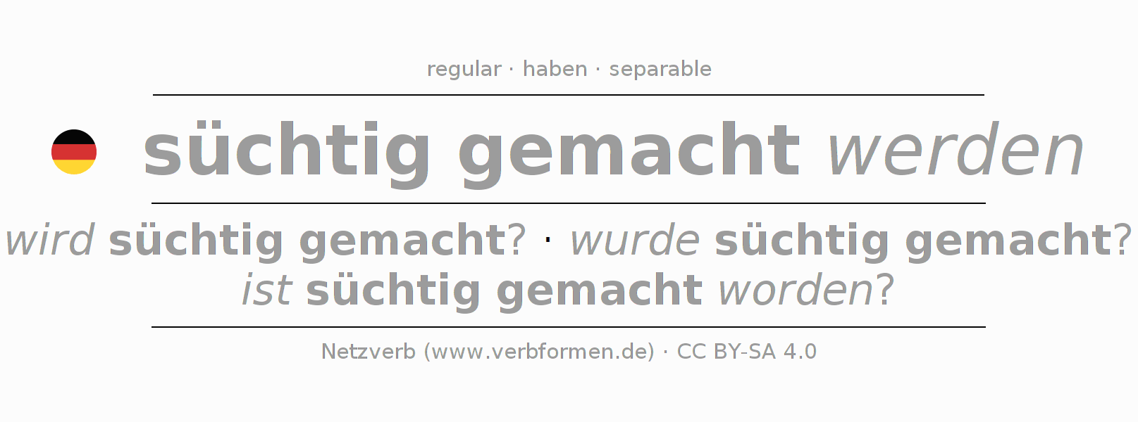 Examples for using the conjugation of the verb süchtigmachen. These are real sentences and sentences from the project Tatoeba. For each conjugated form, such a sentence example is displayed. The verb form is highlighted. If there are more than one sentence, an example with the German verb süchtigmachen is selected. In order to understand the conjugation not only by the examples, but also to train, worksheets for the verb süchtigmachen are available.