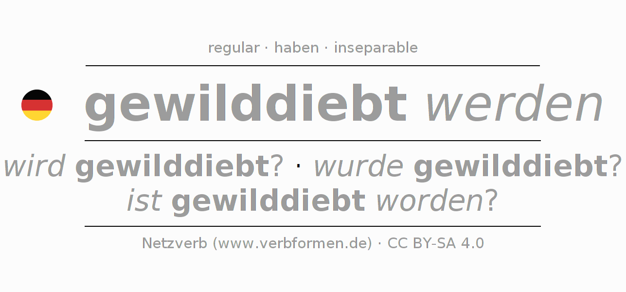 Examples for using the conjugation of the verb wilddieben. These are real sentences and sentences from the project Tatoeba. For each conjugated form, such a sentence example is displayed. The verb form is highlighted. If there are more than one sentence, an example with the German verb wilddieben is selected. In order to understand the conjugation not only by the examples, but also to train, worksheets for the verb wilddieben are available.