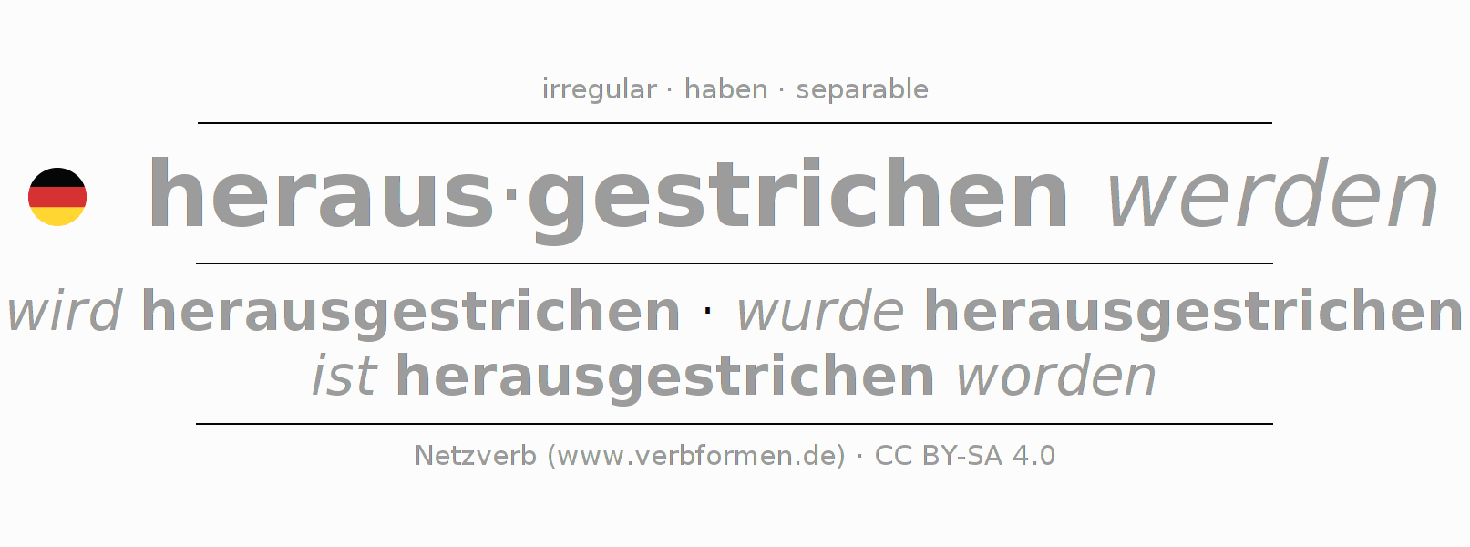Examples for using the conjugation of the verb herausstreichen. These are real sentences and sentences from the project Tatoeba. For each conjugated form, such a sentence example is displayed. The verb form is highlighted. If there are more than one sentence, an example with the German verb herausstreichen is selected. In order to understand the conjugation not only by the examples, but also to train, worksheets for the verb herausstreichen are available.