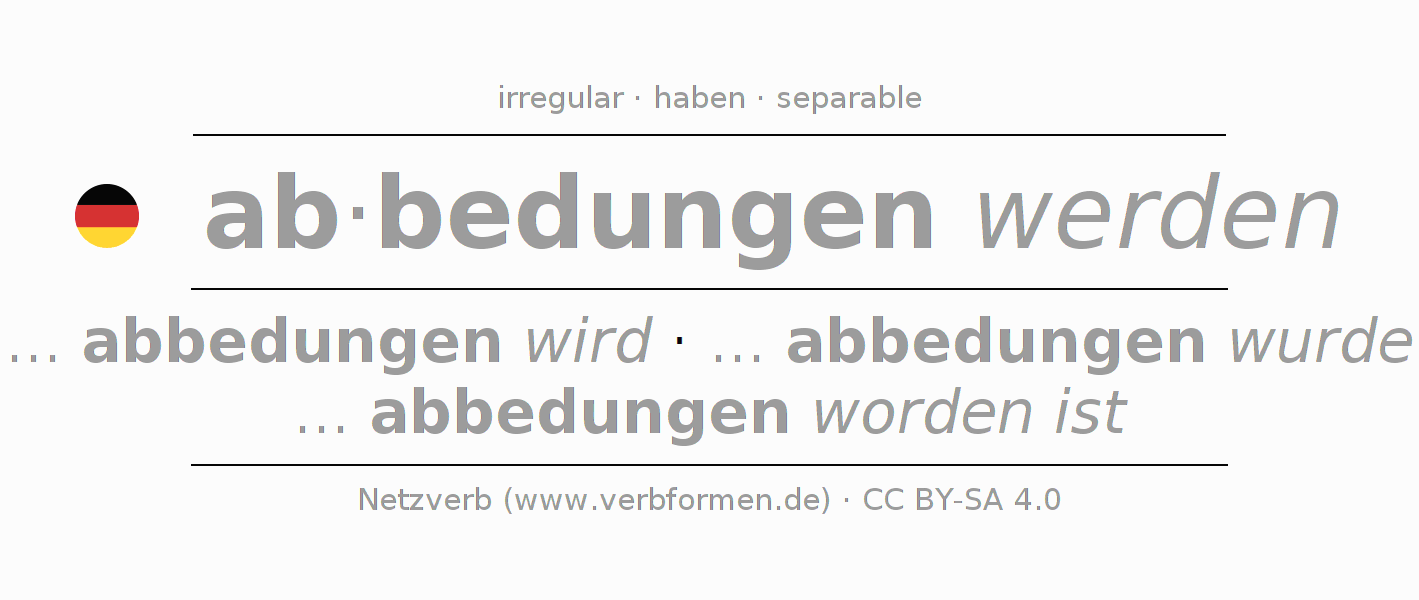 Examples for using the conjugation of the verb abbedingen. These are real sentences and sentences from the project Tatoeba. For each conjugated form, such a sentence example is displayed. The verb form is highlighted. If there are more than one sentence, an example with the German verb abbedingen is selected. In order to understand the conjugation not only by the examples, but also to train, worksheets for the verb abbedingen are available.