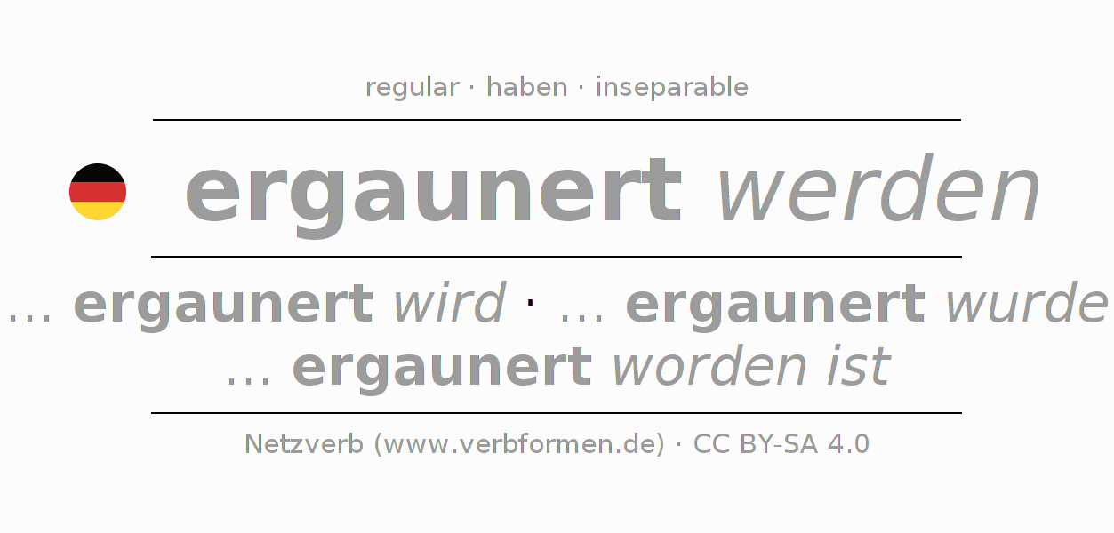 Examples for using the conjugation of the verb ergaunern. These are real sentences and sentences from the project Tatoeba. For each conjugated form, such a sentence example is displayed. The verb form is highlighted. If there are more than one sentence, an example with the German verb ergaunern is selected. In order to understand the conjugation not only by the examples, but also to train, worksheets for the verb ergaunern are available.