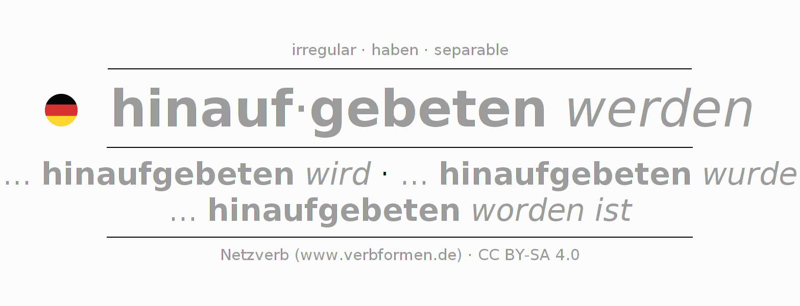 Examples for using the conjugation of the verb hinaufbitten. These are real sentences and sentences from the project Tatoeba. For each conjugated form, such a sentence example is displayed. The verb form is highlighted. If there are more than one sentence, an example with the German verb hinaufbitten is selected. In order to understand the conjugation not only by the examples, but also to train, worksheets for the verb hinaufbitten are available.