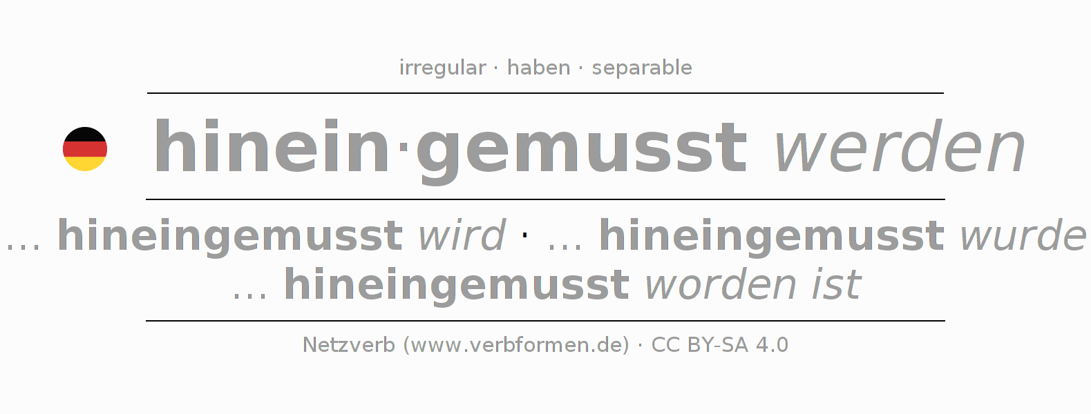 Examples for using the conjugation of the verb hineinmüssen. These are real sentences and sentences from the project Tatoeba. For each conjugated form, such a sentence example is displayed. The verb form is highlighted. If there are more than one sentence, an example with the German verb hineinmüssen is selected. In order to understand the conjugation not only by the examples, but also to train, worksheets for the verb hineinmüssen are available.