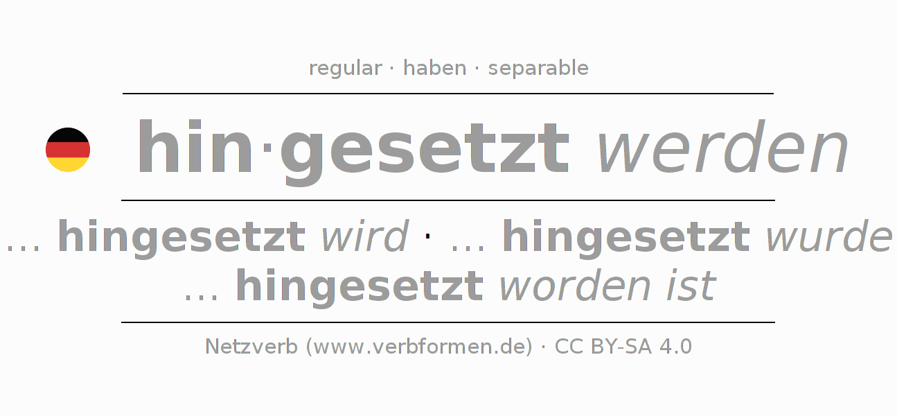 Examples for using the conjugation of the verb hinsetzen. These are real sentences and sentences from the project Tatoeba. For each conjugated form, such a sentence example is displayed. The verb form is highlighted. If there are more than one sentence, an example with the German verb hinsetzen is selected. In order to understand the conjugation not only by the examples, but also to train, worksheets for the verb hinsetzen are available.
