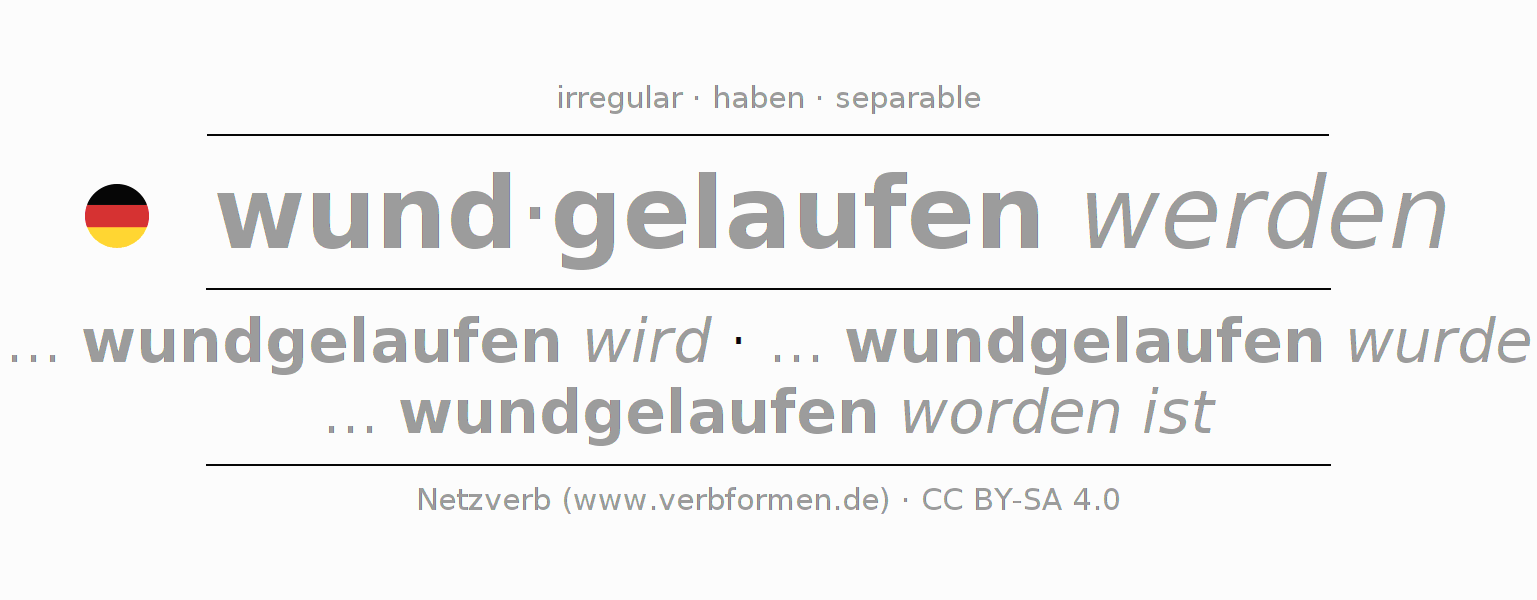 Examples for using the conjugation of the verb wundlaufen. These are real sentences and sentences from the project Tatoeba. For each conjugated form, such a sentence example is displayed. The verb form is highlighted. If there are more than one sentence, an example with the German verb wundlaufen is selected. In order to understand the conjugation not only by the examples, but also to train, worksheets for the verb wundlaufen are available.