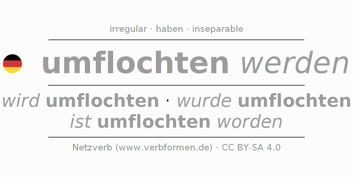 Examples for using the conjugation of the verb umflechten. These are real sentences and sentences from the project Tatoeba. For each conjugated form, such a sentence example is displayed. The verb form is highlighted. If there are more than one sentence, an example with the German verb umflechten is selected. In order to understand the conjugation not only by the examples, but also to train, worksheets for the verb umflechten are available.