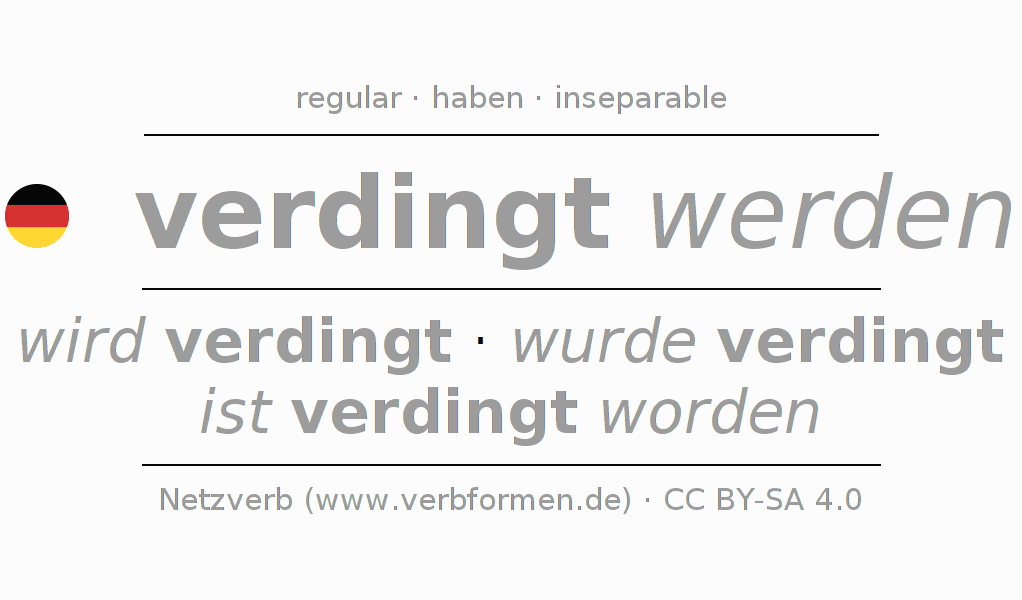 Examples for using the conjugation of the verb verdingen. These are real sentences and sentences from the project Tatoeba. For each conjugated form, such a sentence example is displayed. The verb form is highlighted. If there are more than one sentence, an example with the German verb verdingen (regelm) is selected. In order to understand the conjugation not only by the examples, but also to train, worksheets for the verb verdingen are available.