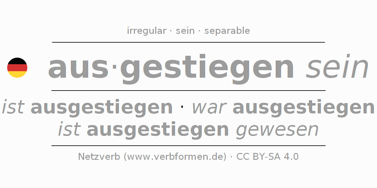 Examples for using the conjugation of the verb aussteigen. These are real sentences and sentences from the project Tatoeba. For each conjugated form, such a sentence example is displayed. The verb form is highlighted. If there are more than one sentence, an example with the German verb aussteigen is selected. In order to understand the conjugation not only by the examples, but also to train, worksheets for the verb aussteigen are available.