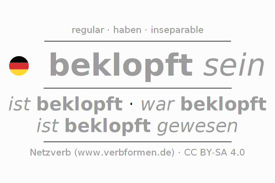 Examples for using the conjugation of the verb beklopfen. These are real sentences and sentences from the project Tatoeba. For each conjugated form, such a sentence example is displayed. The verb form is highlighted. If there are more than one sentence, an example with the German verb beklopfen is selected. In order to understand the conjugation not only by the examples, but also to train, worksheets for the verb beklopfen are available.