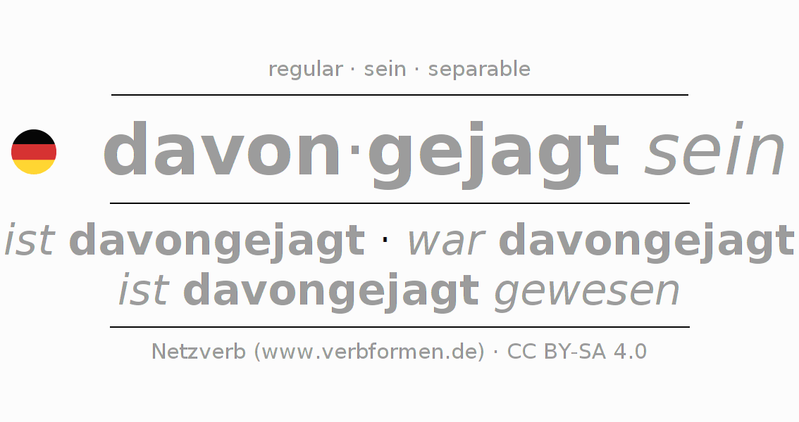 Examples for using the conjugation of the verb davonjagen. These are real sentences and sentences from the project Tatoeba. For each conjugated form, such a sentence example is displayed. The verb form is highlighted. If there are more than one sentence, an example with the German verb davonjagen (ist) is selected. In order to understand the conjugation not only by the examples, but also to train, worksheets for the verb davonjagen are available.