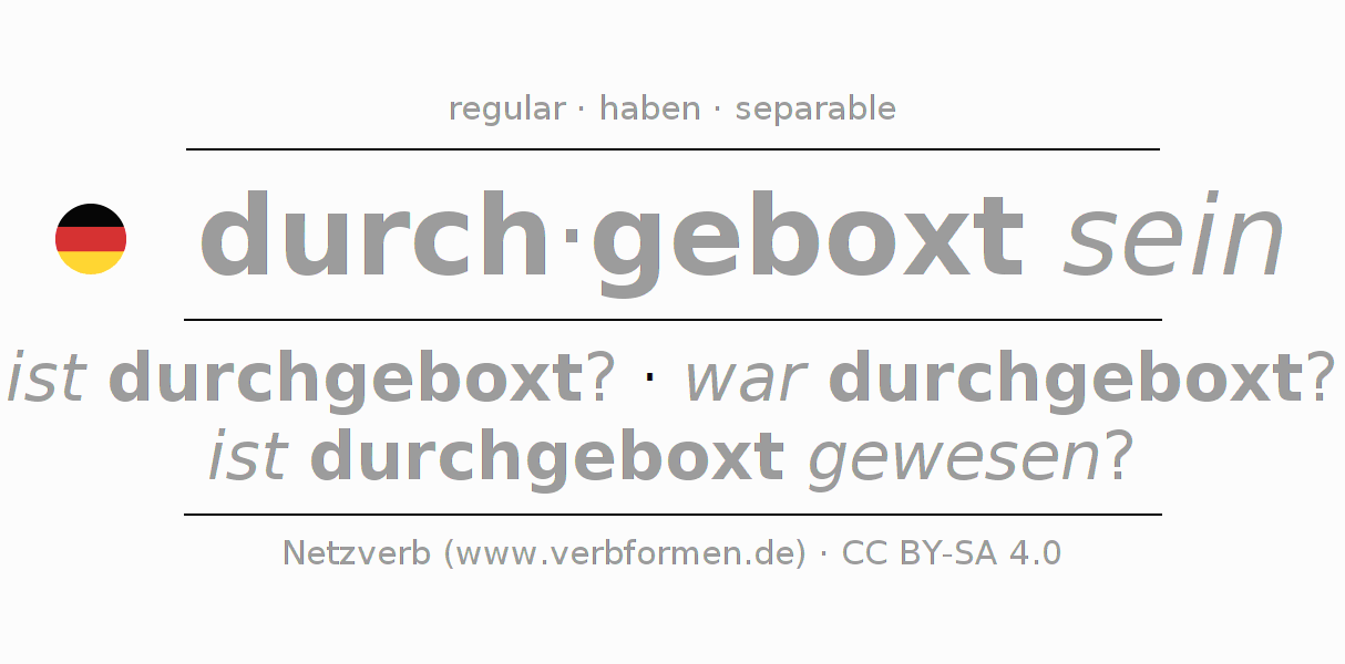 Examples for using the conjugation of the verb durchboxen. These are real sentences and sentences from the project Tatoeba. For each conjugated form, such a sentence example is displayed. The verb form is highlighted. If there are more than one sentence, an example with the German verb durchboxen is selected. In order to understand the conjugation not only by the examples, but also to train, worksheets for the verb durchboxen are available.
