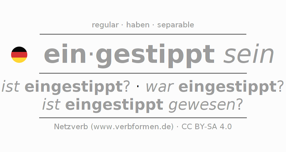 Examples for using the conjugation of the verb einstippen. These are real sentences and sentences from the project Tatoeba. For each conjugated form, such a sentence example is displayed. The verb form is highlighted. If there are more than one sentence, an example with the German verb einstippen is selected. In order to understand the conjugation not only by the examples, but also to train, worksheets for the verb einstippen are available.