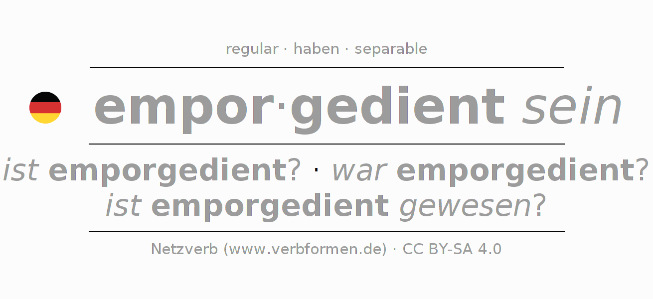 Examples for using the conjugation of the verb empordienen. These are real sentences and sentences from the project Tatoeba. For each conjugated form, such a sentence example is displayed. The verb form is highlighted. If there are more than one sentence, an example with the German verb empordienen is selected. In order to understand the conjugation not only by the examples, but also to train, worksheets for the verb empordienen are available.