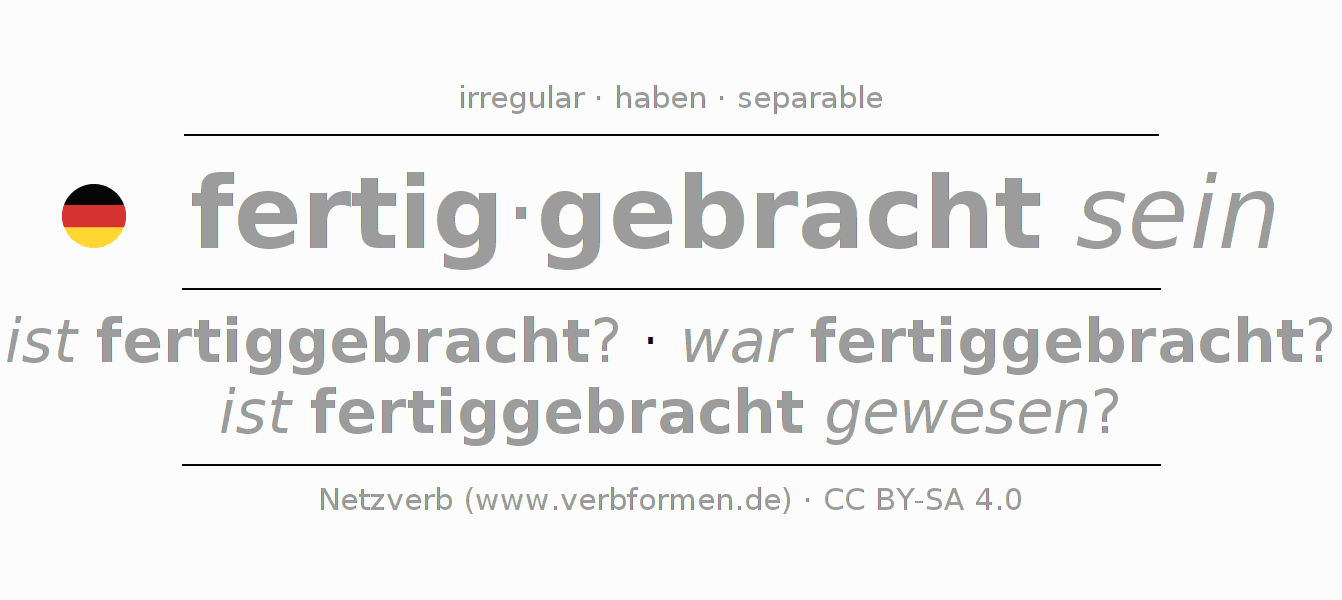 Examples for using the conjugation of the verb fertigbringen. These are real sentences and sentences from the project Tatoeba. For each conjugated form, such a sentence example is displayed. The verb form is highlighted. If there are more than one sentence, an example with the German verb fertigbringen is selected. In order to understand the conjugation not only by the examples, but also to train, worksheets for the verb fertigbringen are available.
