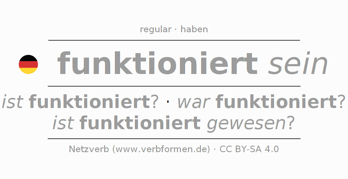 Examples for using the conjugation of the verb funktionieren. These are real sentences and sentences from the project Tatoeba. For each conjugated form, such a sentence example is displayed. The verb form is highlighted. If there are more than one sentence, an example with the German verb funktionieren is selected. In order to understand the conjugation not only by the examples, but also to train, worksheets for the verb funktionieren are available.
