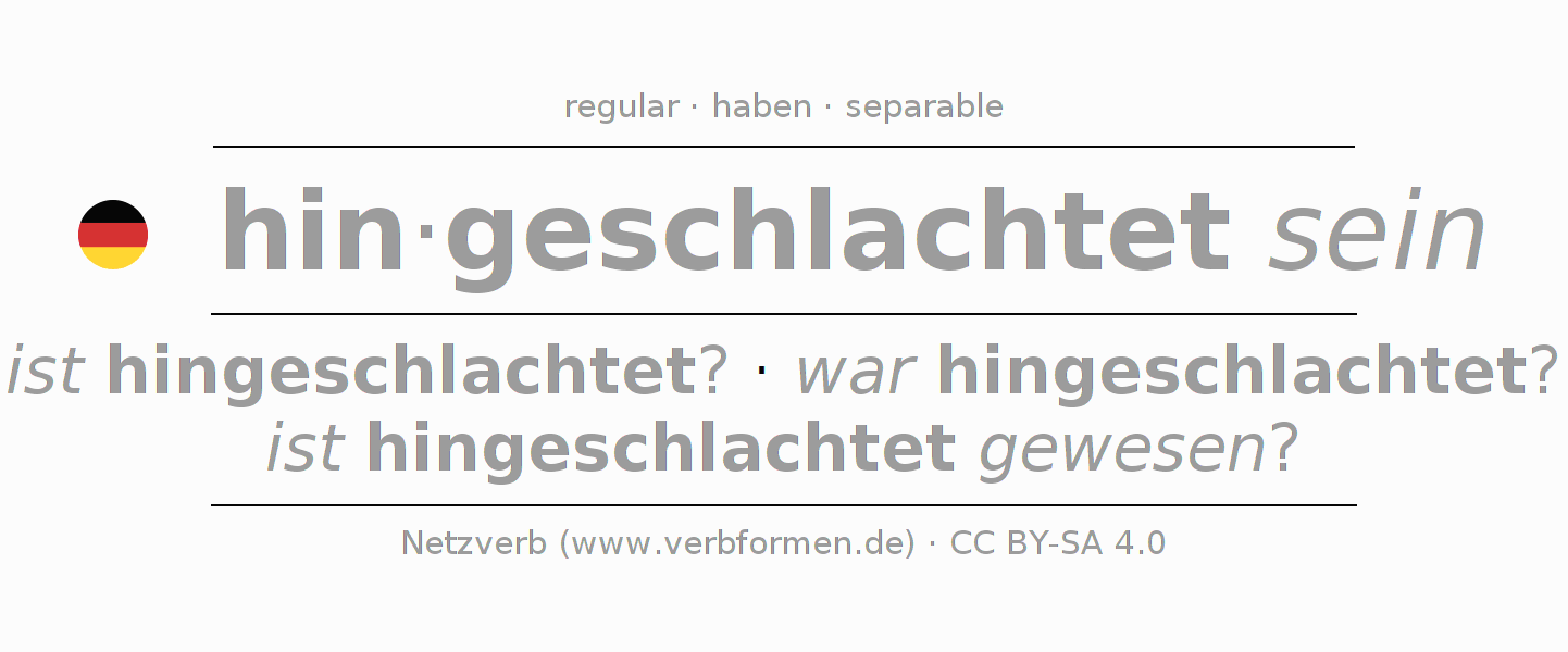 Examples for using the conjugation of the verb hinschlachten. These are real sentences and sentences from the project Tatoeba. For each conjugated form, such a sentence example is displayed. The verb form is highlighted. If there are more than one sentence, an example with the German verb hinschlachten is selected. In order to understand the conjugation not only by the examples, but also to train, worksheets for the verb hinschlachten are available.