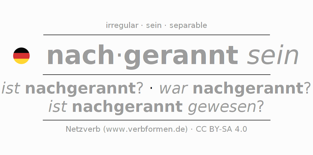 Examples for using the conjugation of the verb nachrennen. These are real sentences and sentences from the project Tatoeba. For each conjugated form, such a sentence example is displayed. The verb form is highlighted. If there are more than one sentence, an example with the German verb nachrennen is selected. In order to understand the conjugation not only by the examples, but also to train, worksheets for the verb nachrennen are available.